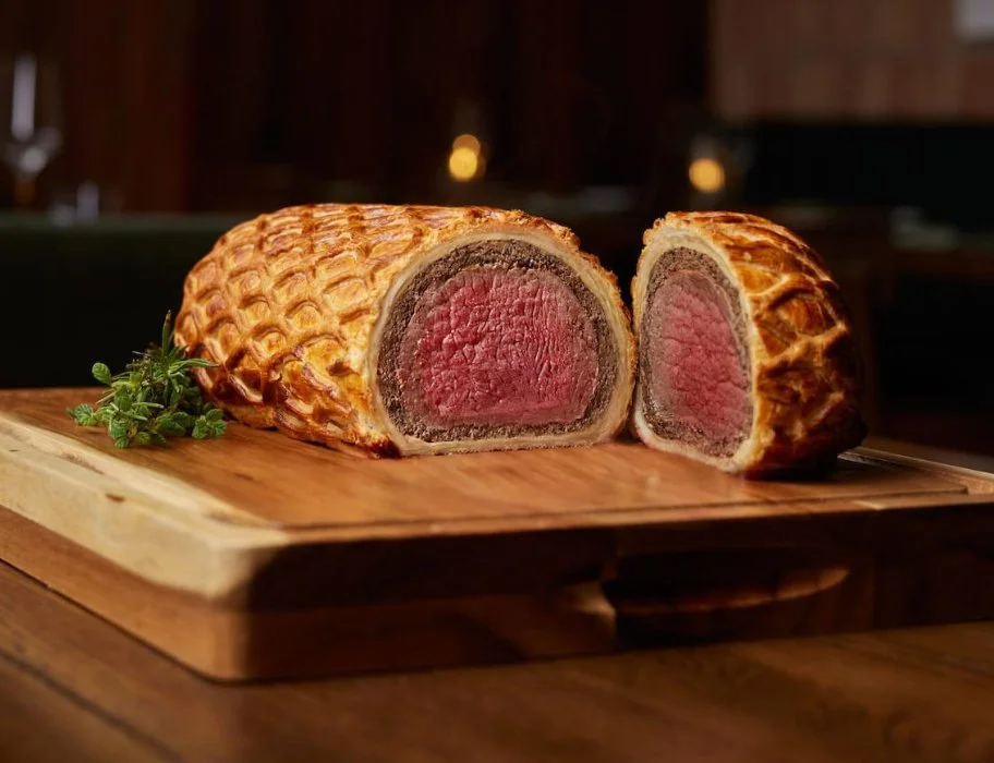Humphreys farm fillet of beef, wrapped in mushroom duxelles, parma ham and puff pastry, finished with pastry lattice.