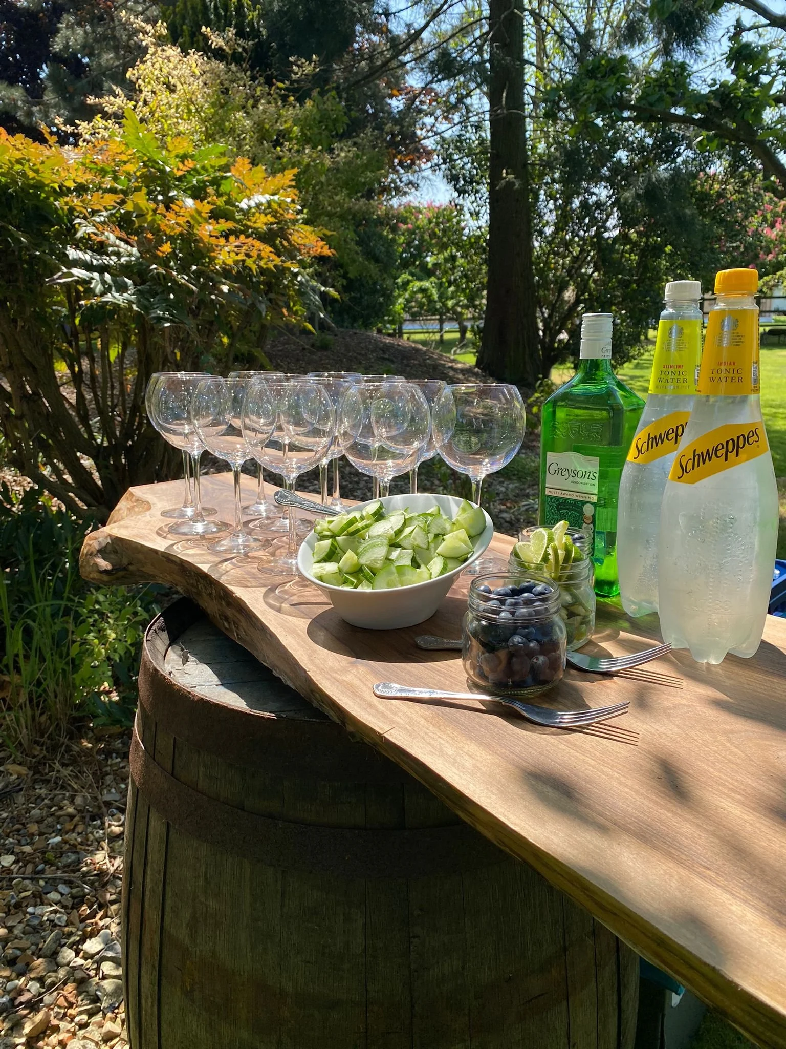 Outdoor party setup with empty wine glasses, bowls of grapes and cucumbers, bottles of tonic water, and utensils on a wooden table in a garden.