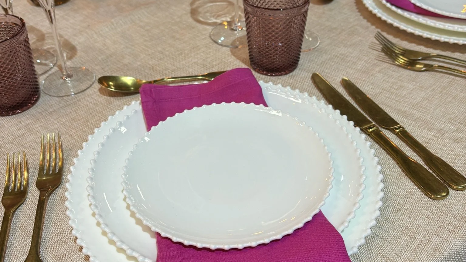 Antique gold cutlery with bright pink napkin and white pearl plates